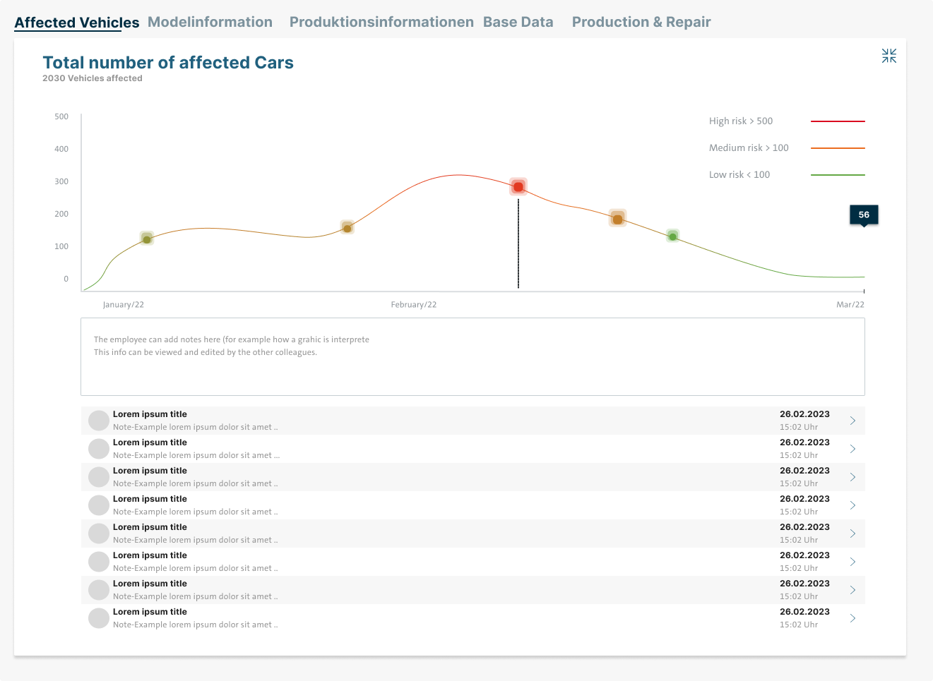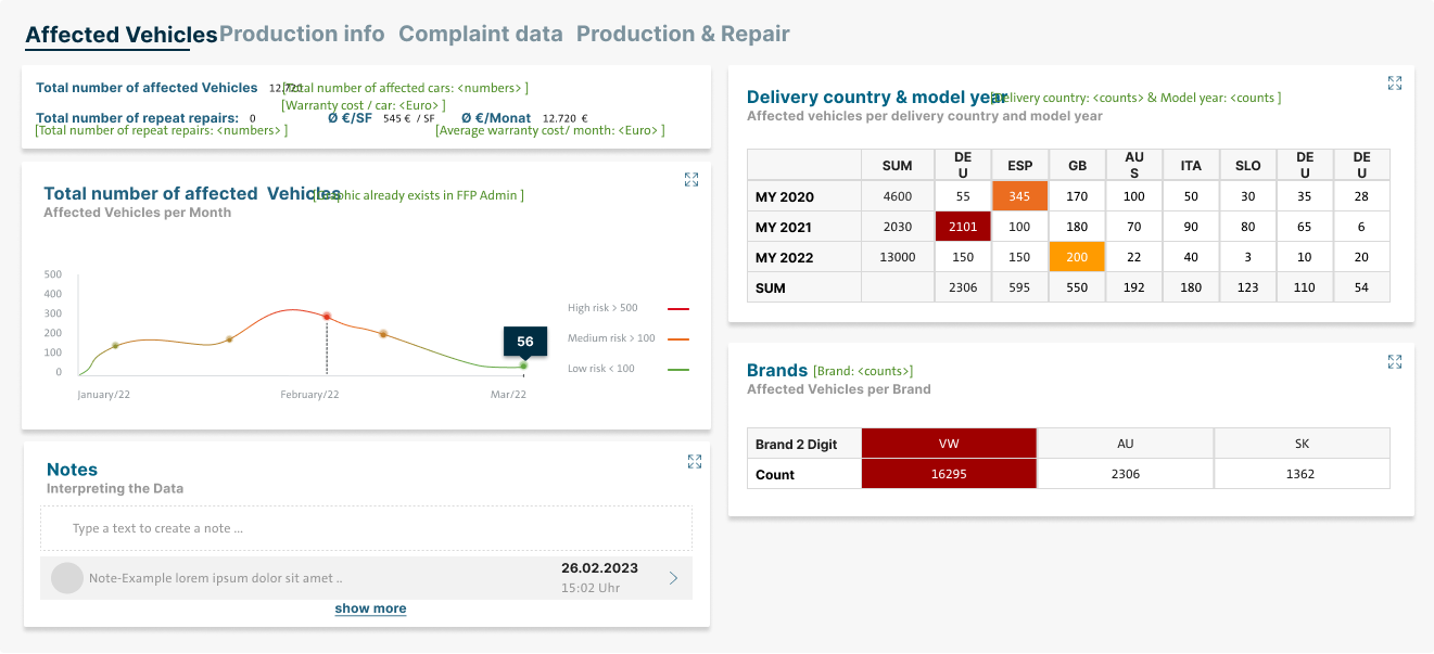 Die finalen Screens für Diagnose Dashboard, DISS Dashboard, die gesplitteten FFP Dashboards und einen exemplarischen Failure Fingerprinting Detail Screen wurden als Figma Paket an die Entwicklung übergeben.